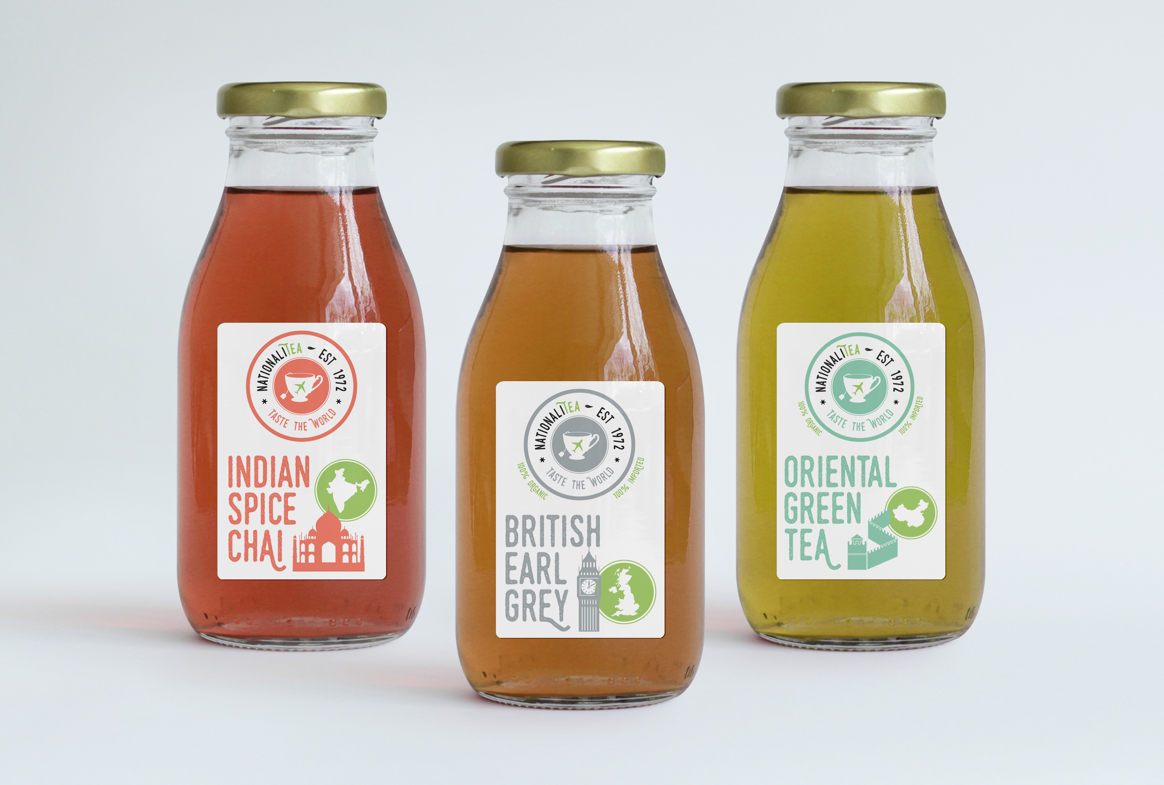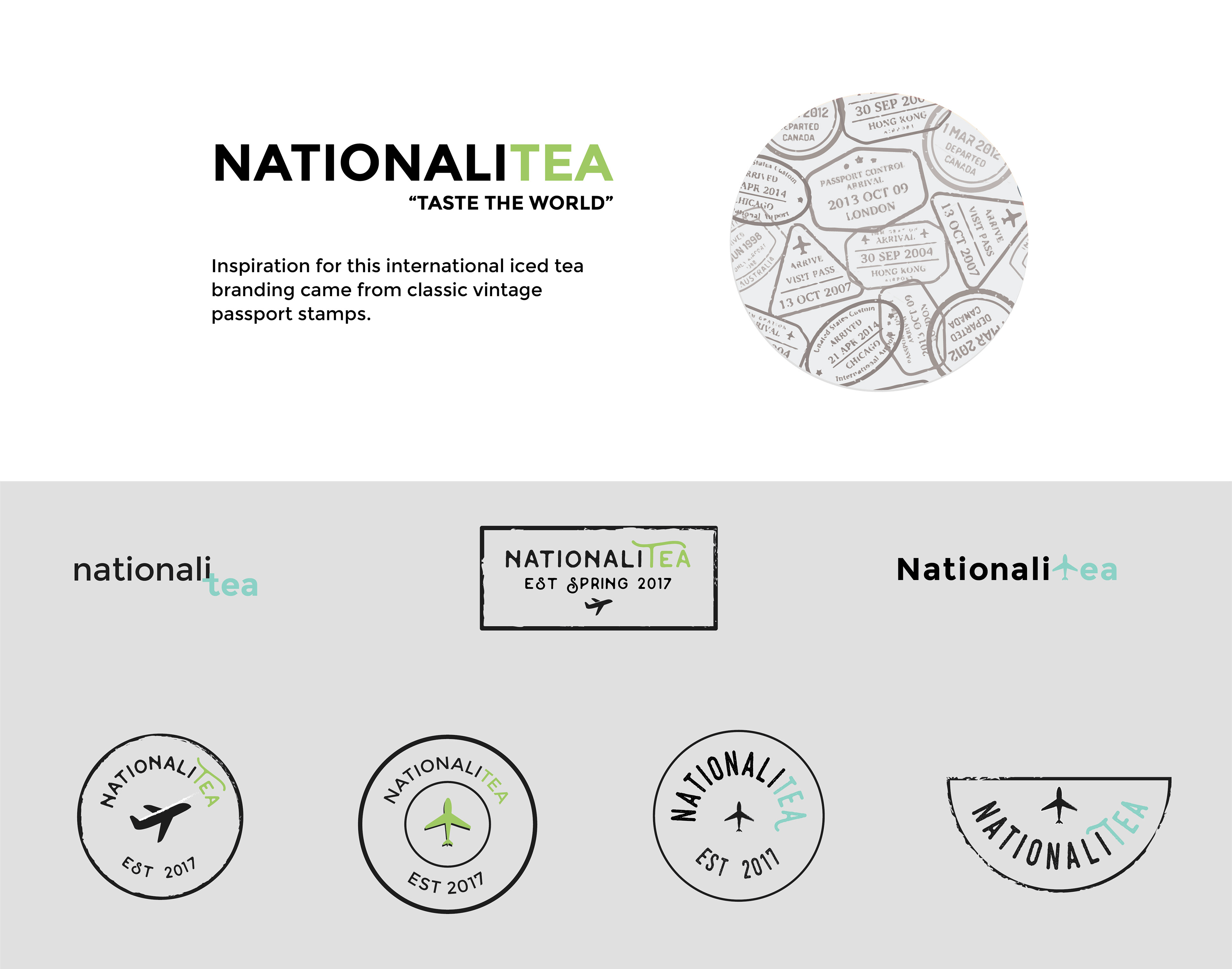This branding and packaging design was created for an international iced tea brand and was meant to resemble a passport stamp. It's clean and communicates the purpose of the brand without being cliche.